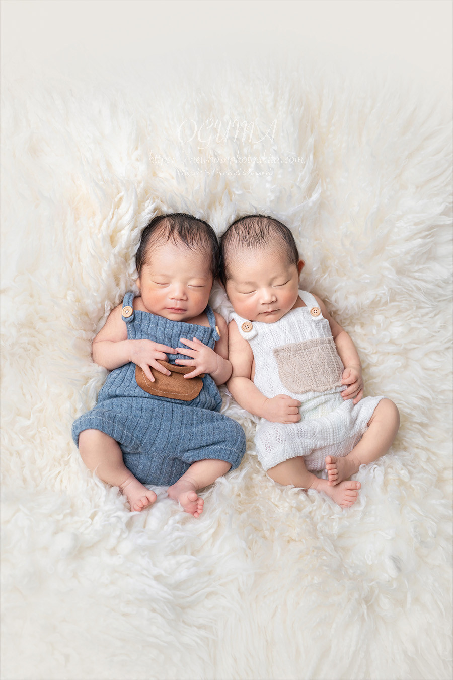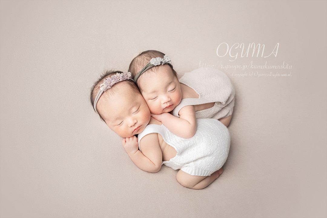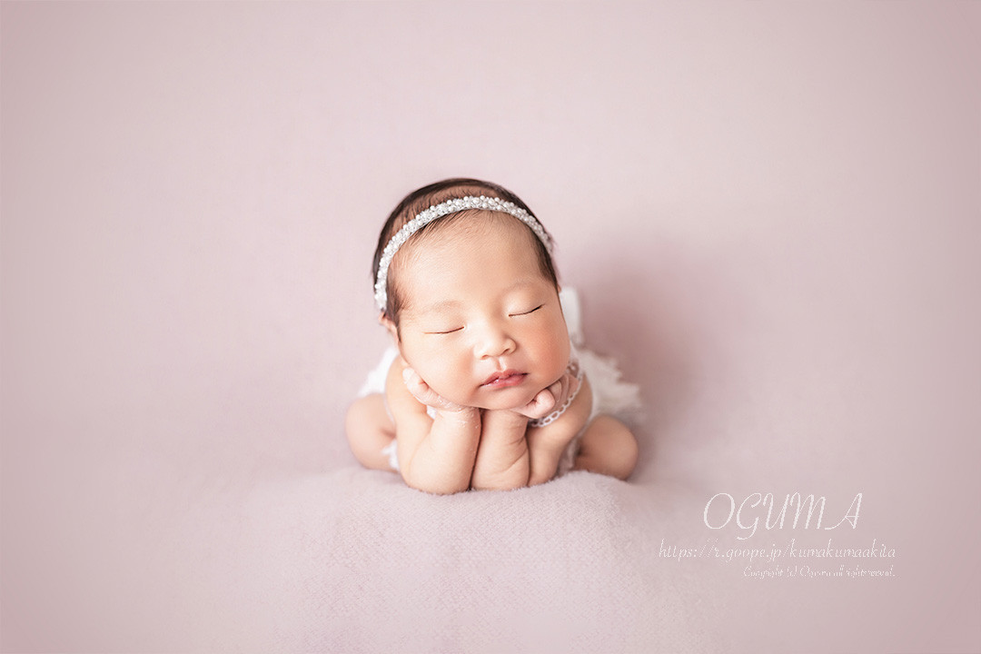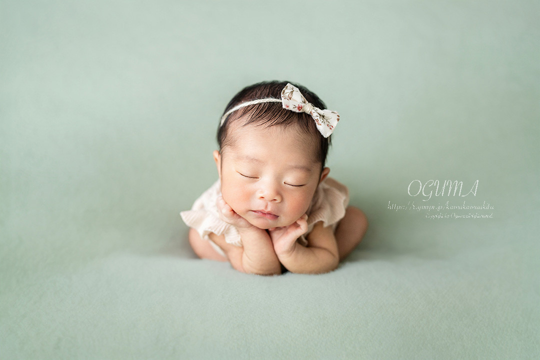 きちんと首を支えて撮影した2枚の写真を合成して1枚のお写真に仕上げます。ご家族の方にお手伝いを少しお願いいたします。深い眠りが必要なポーズです。どうしてもできない場合には、うつぶせポーズ2種類に変更します。